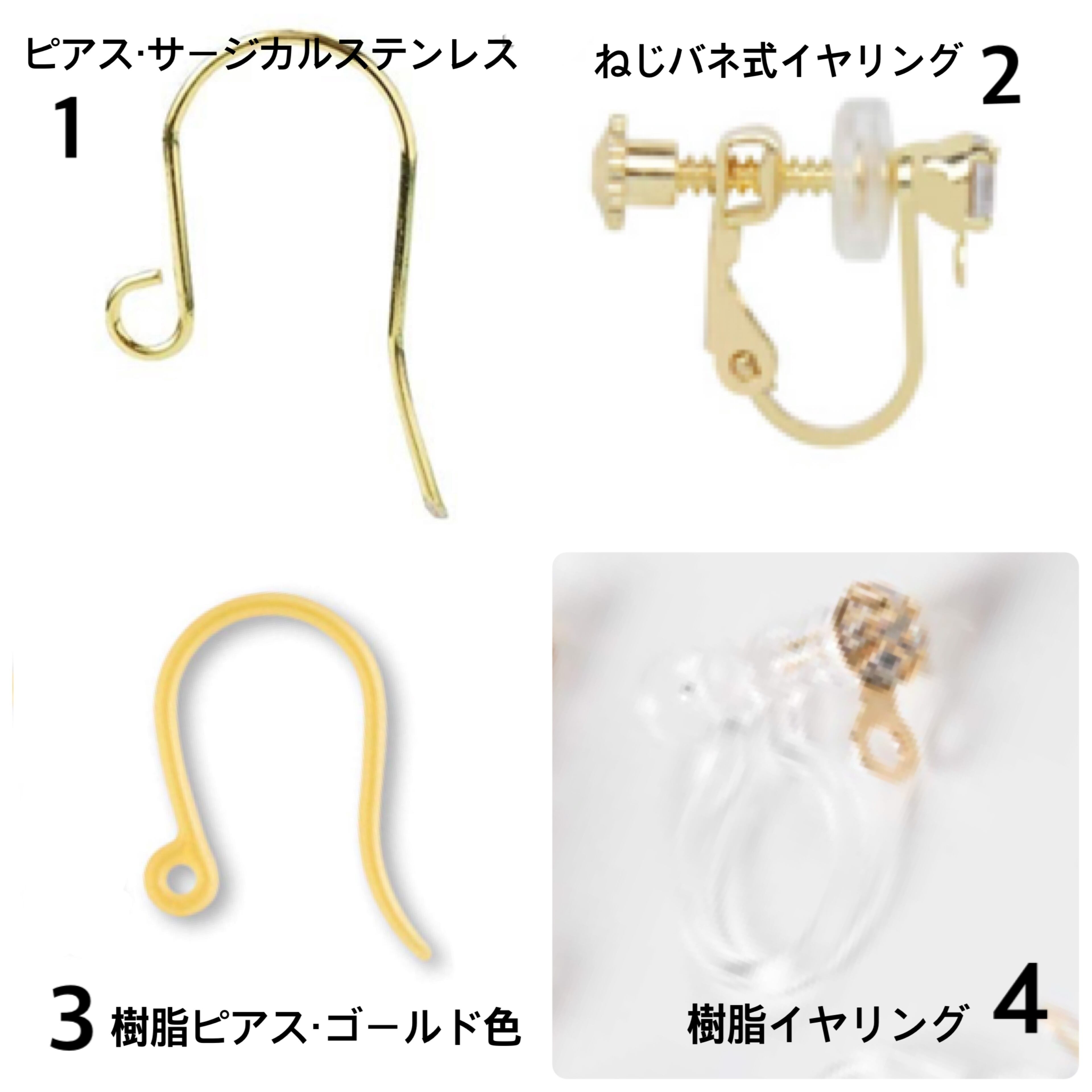樹脂ピアス、樹脂イヤリング、ねじバネ式イヤリングから、